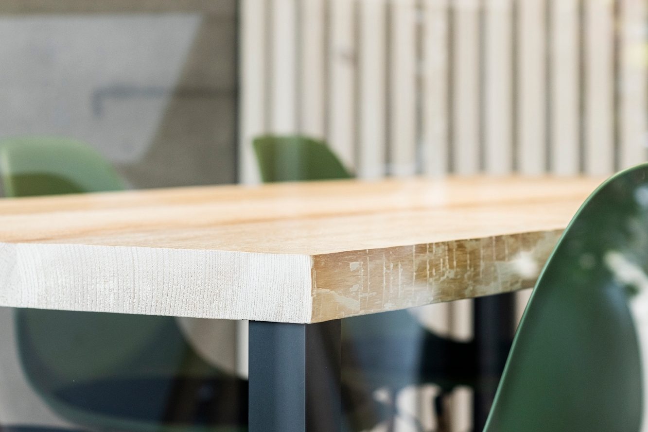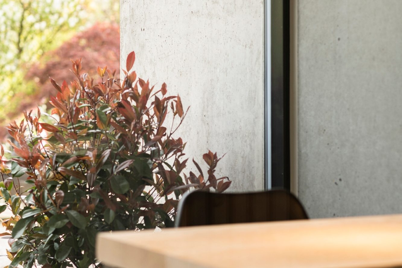 Die Gestaltung soll einen natürlichen Stil erhalten. Rohmaterialien des Gebäudes übernommen werden. Darum wurden die Betonpfeiler und die repräsentative Betonwand wieder in Ihren natürlichen Zustand zurückgeholt. Die zierlichen Fichtenhölze sind der akzenturierte Kontrast zu Beton und Metall.